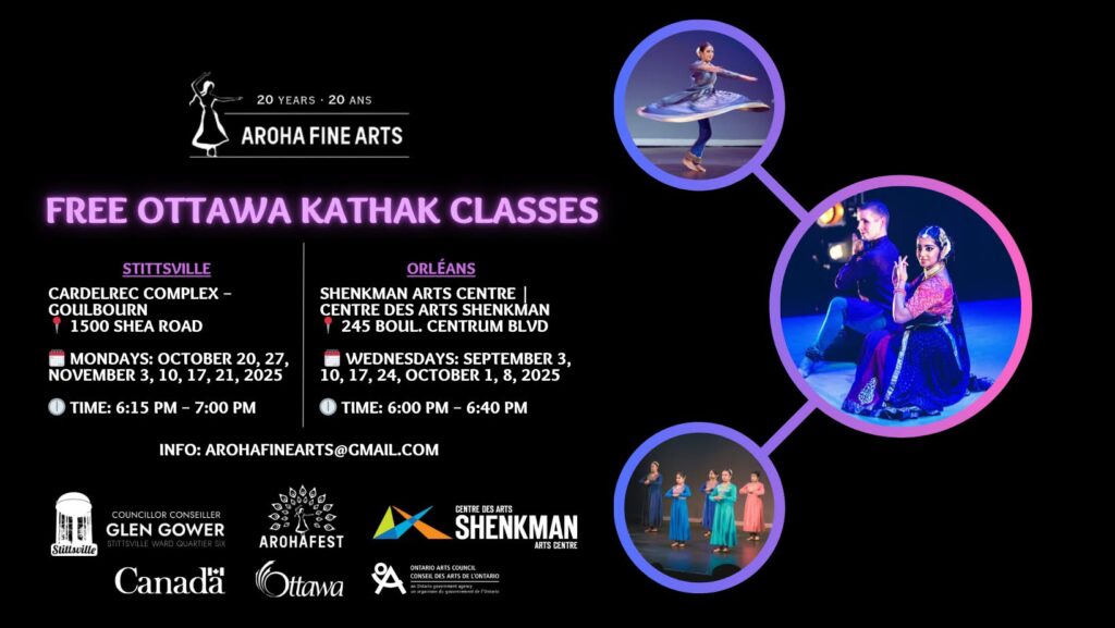 Free Kathak classes in Stittsville. Mondays October 20, 27, November 3, 10, 17, 21, 2025. Click here to register